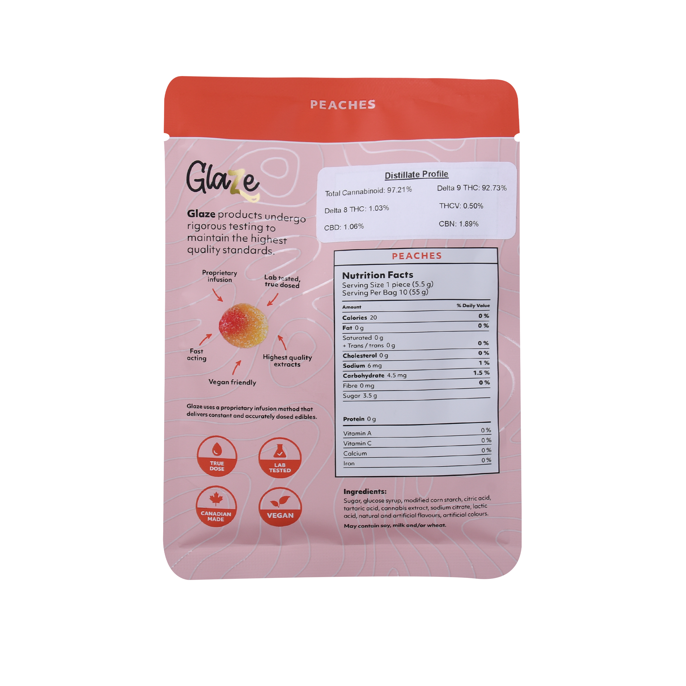 Experience the juicy sweetness and potency of Peaches by Glaze. Each box contains ten bags, meticulously dosed at 400mg each, offering a flavourful and potent cannabis experience.
